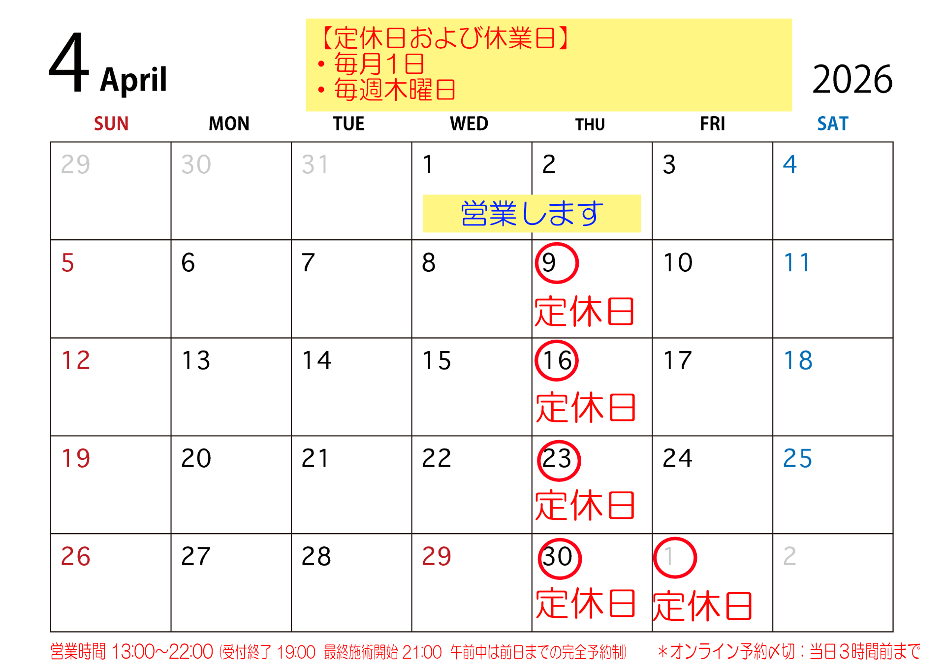 令和8年 4月の営業予定(都合により、4/1 & 4/2 を営業日にしています。振替無し。)