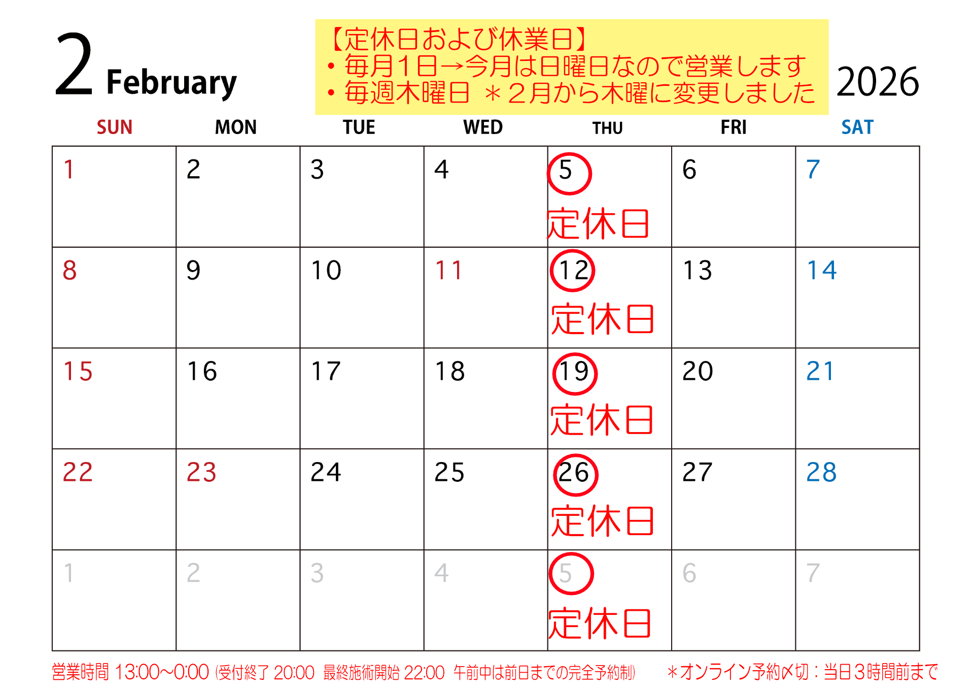 令和8年 2月の営業予定